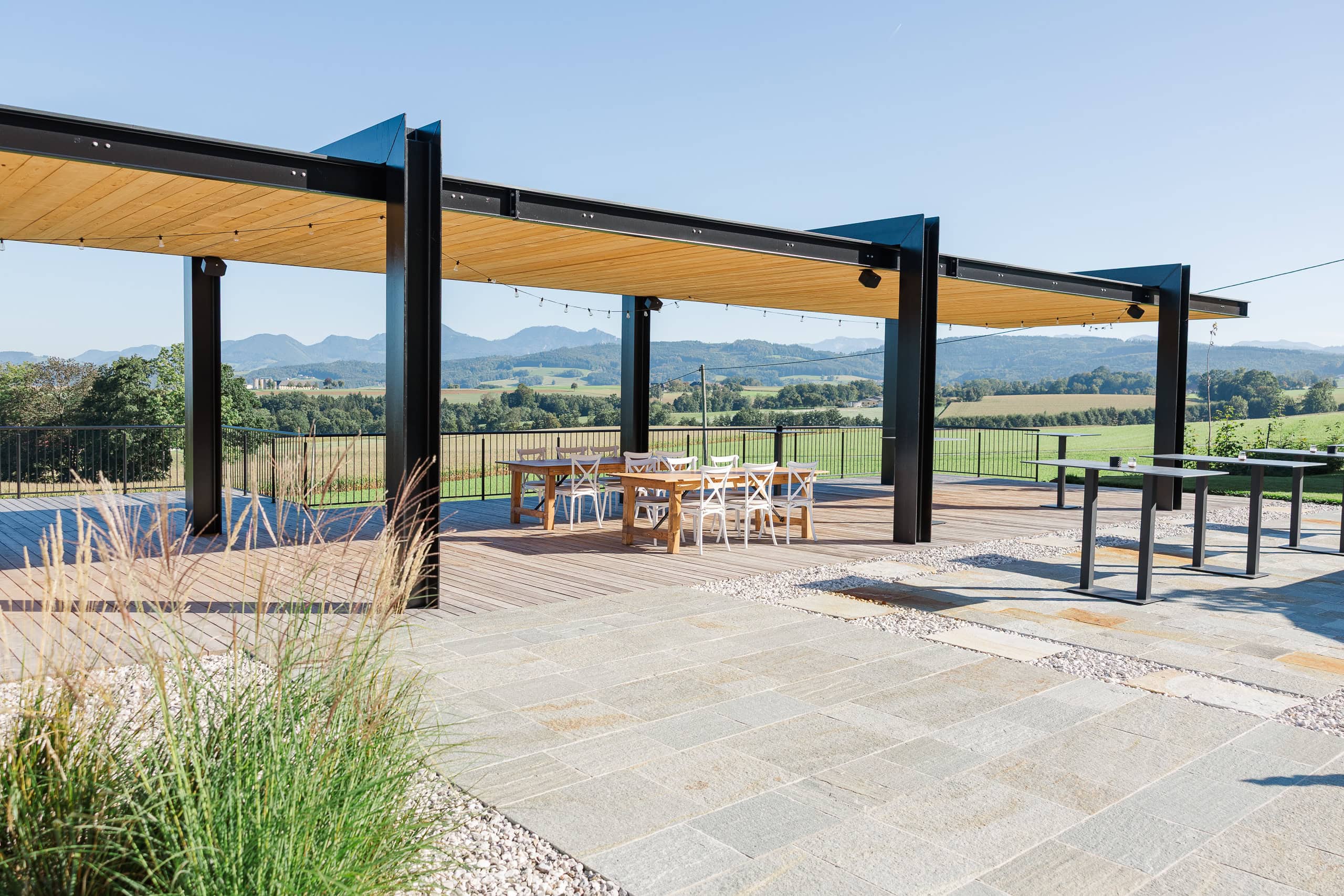 Die Agape fand auf der neuen Panoramaterrasse statt, mit Blick auf die Kremsmauer und die Hügel ringsum. Bei diesem Wetter im September – warm, klar, mit langsam weicher werdendem Licht – war das ein Bild, das man festhalten möchte. Genau das habe ich getan.