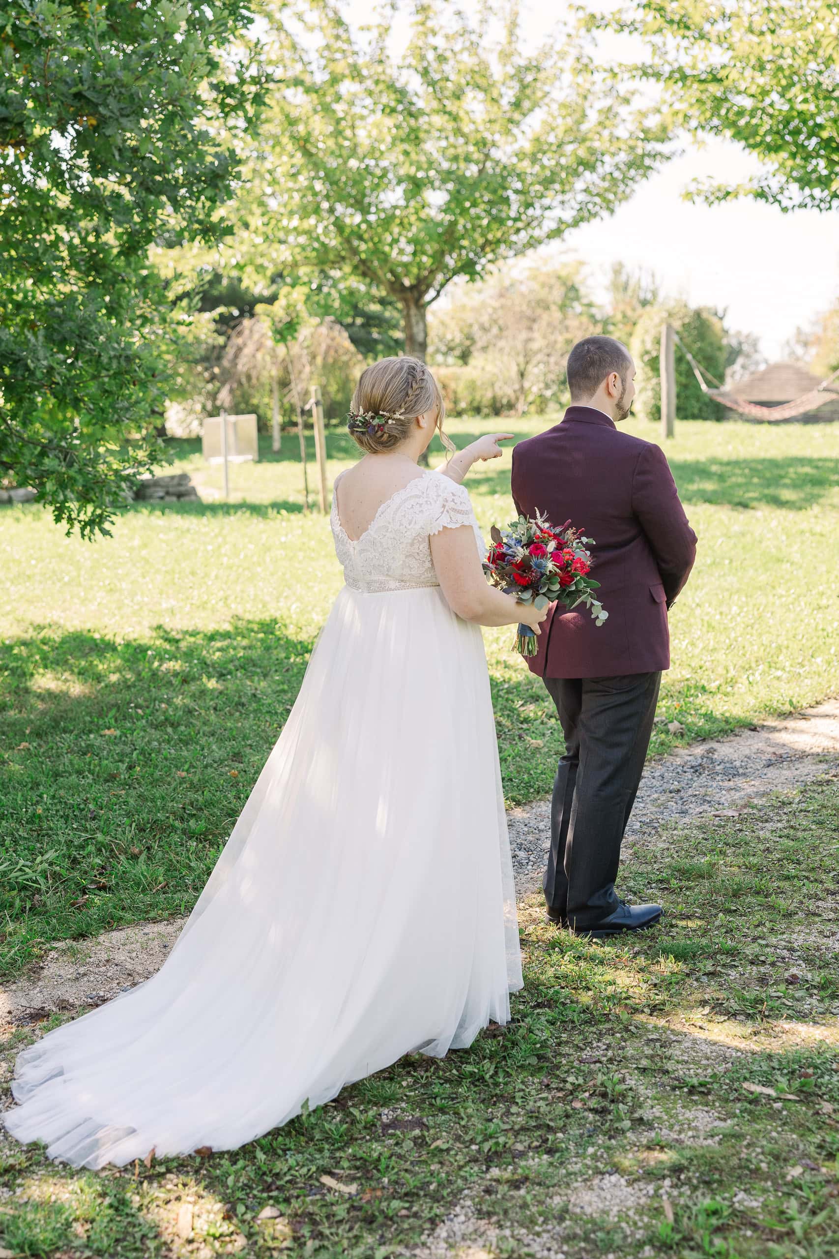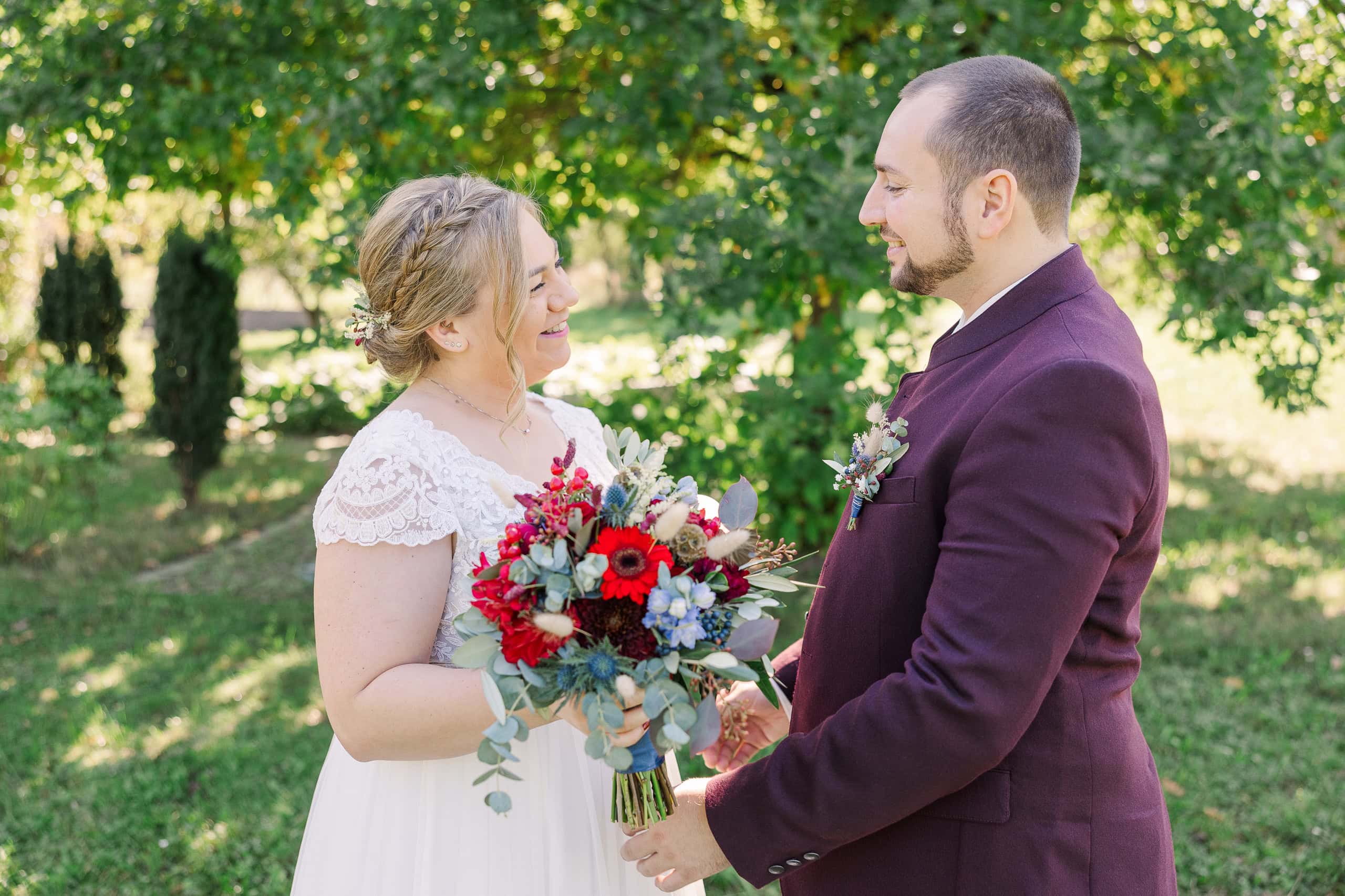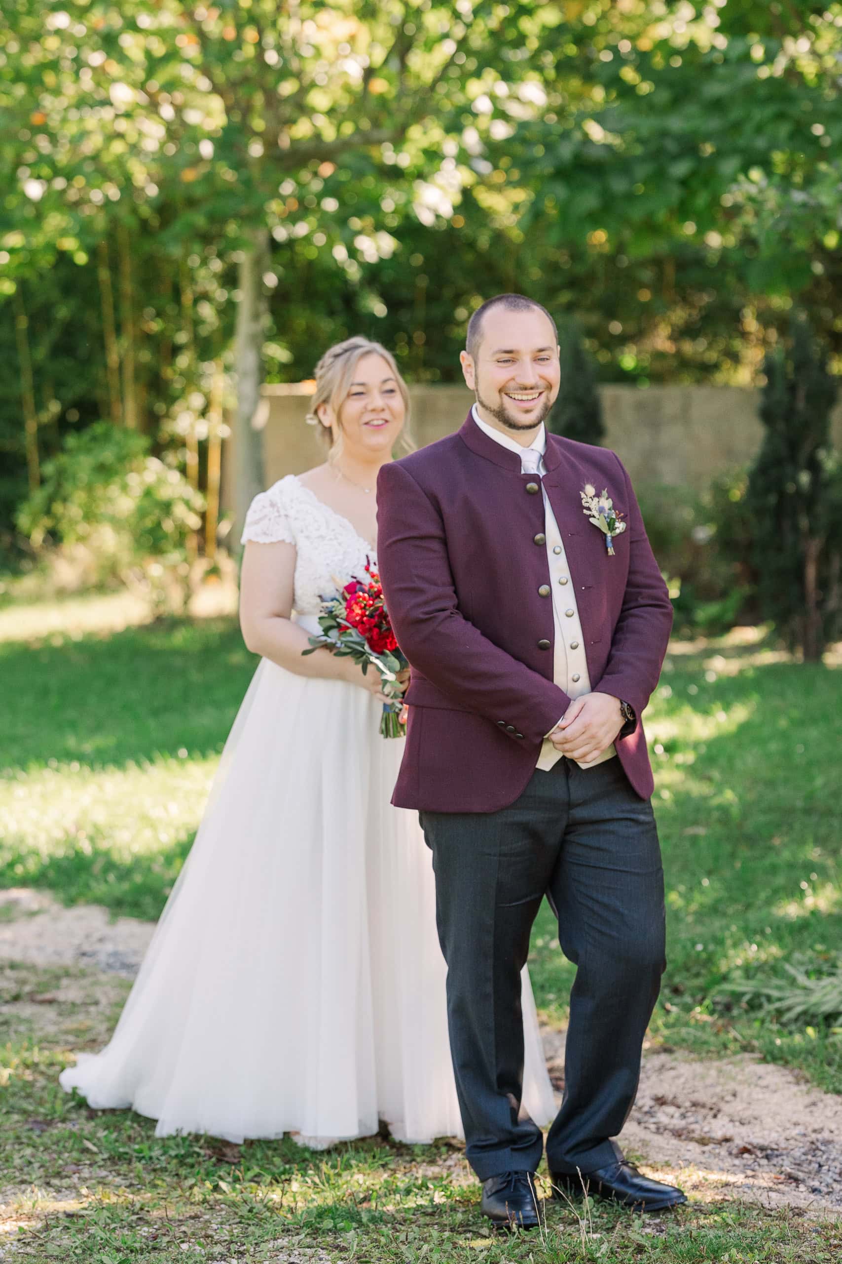Bevor es in die Kirche ging, hatten Katja und Stefan einen Moment nur für sich geplant: den First Look im Park der Gartenbauschule Ritzlhof. Ich liebe diese Location für Paarfotos – an jeder Ecke findet man andere Motive, alte Bäume, verschlungene Wege und eine Vielfalt an Grün, die man so selten auf einem Fleck hat.