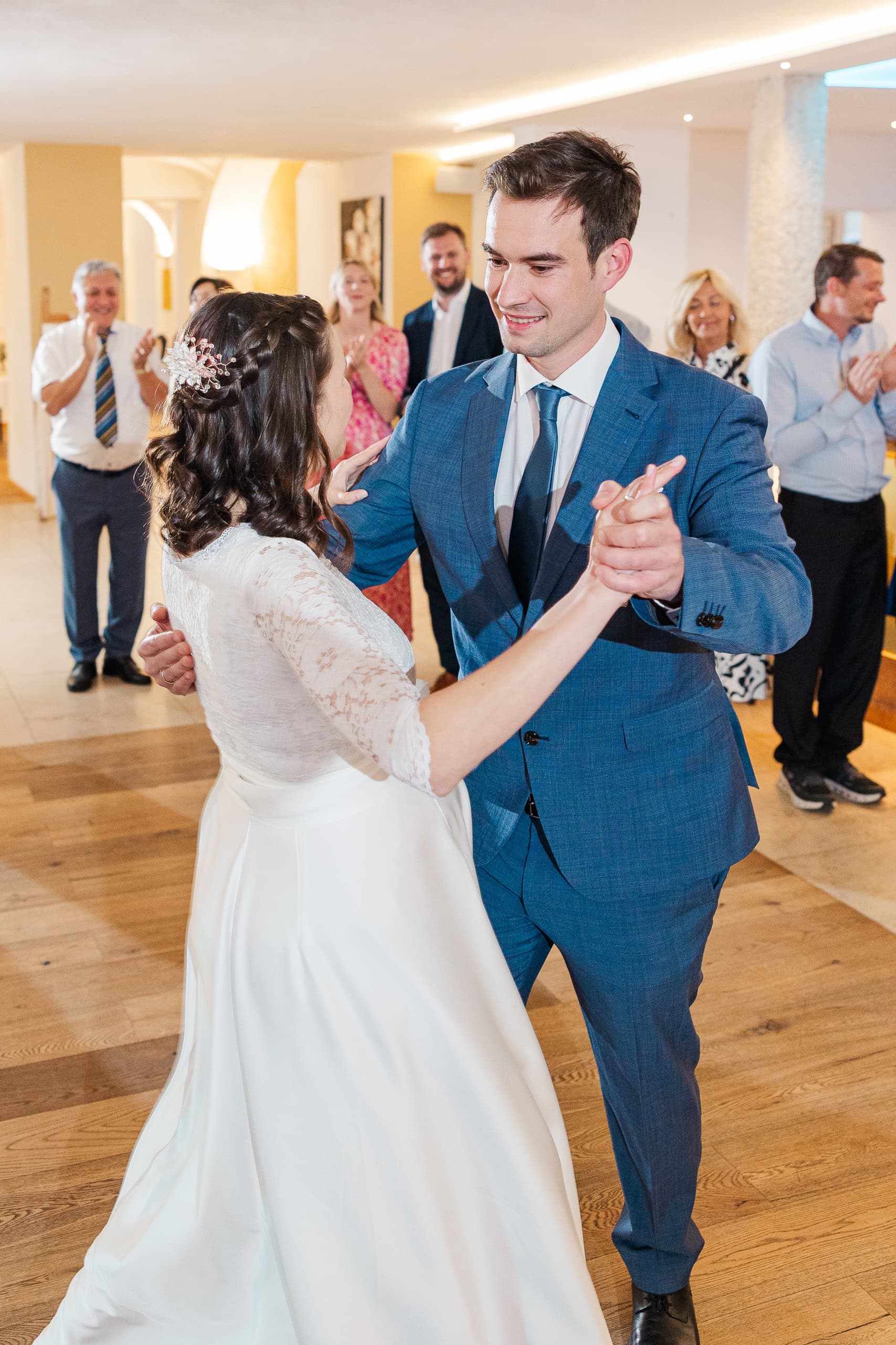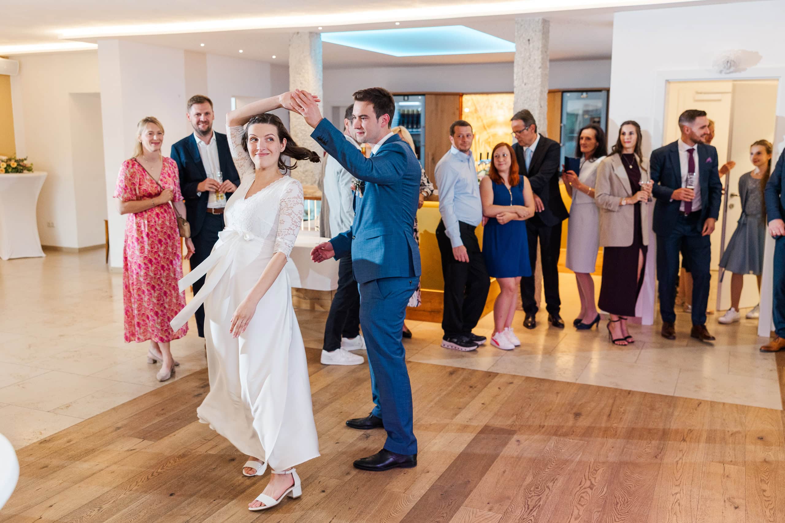 Mit dem Eintreffen der Abendgäste begann der zweite Teil des Tages. Tortenanschnitt, erster Tanz, und dann übernahm die Tanzfläche im Festsaalgewölbe. Die Bar, die Musik, das warme Licht des Saals – der perfekte Rahmen, um den Tag ausklingen zu lassen.