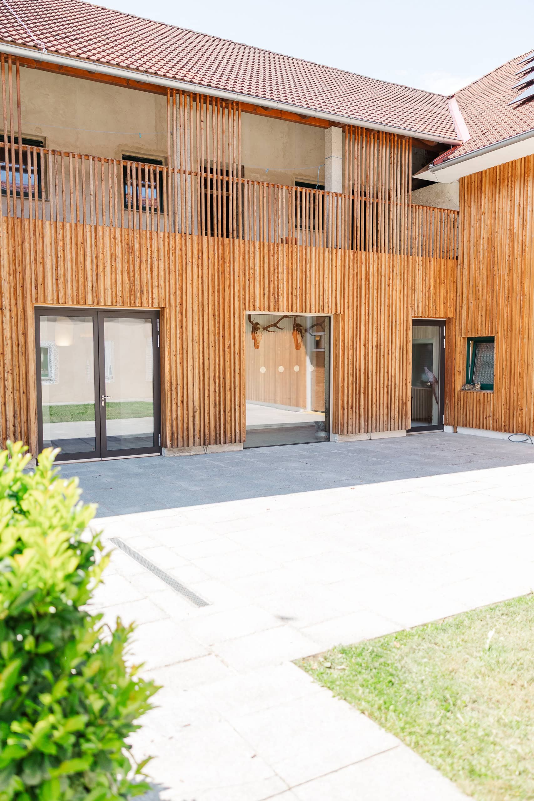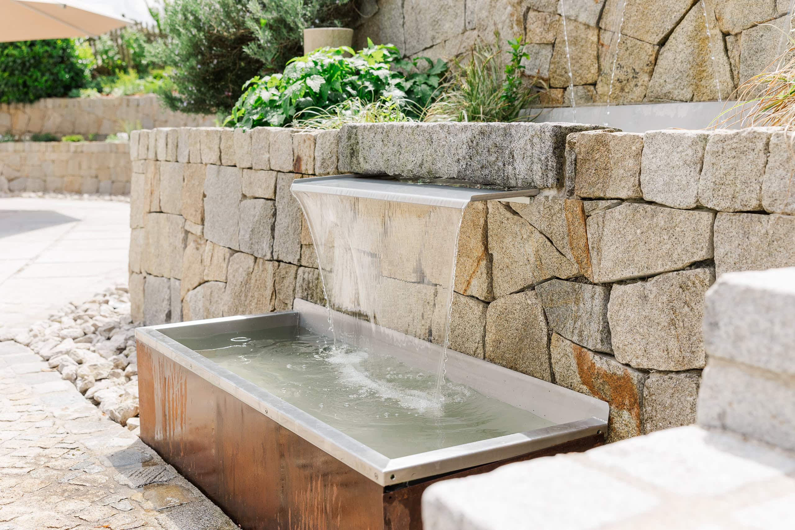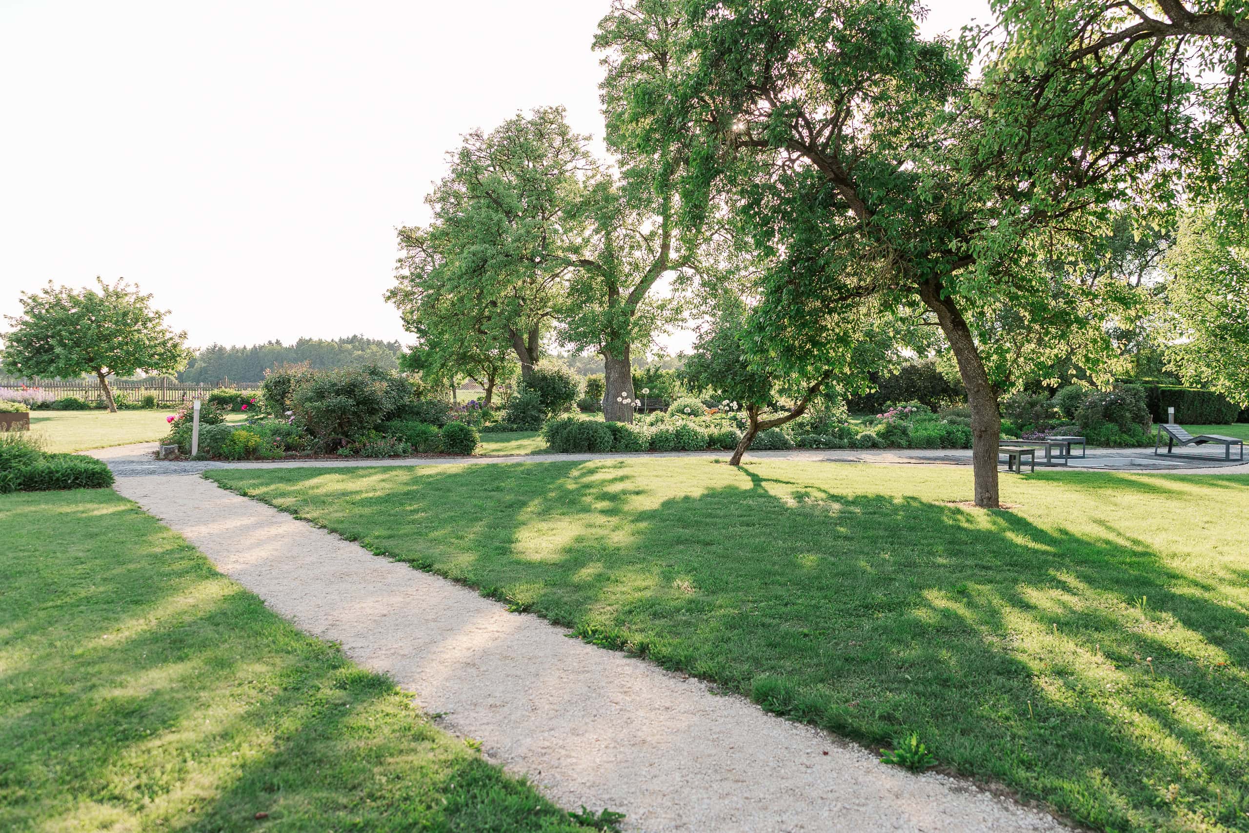 Wir sind eine kleine Runde gegangen, die ich mir beim Scouting vorab ausgesucht hatte: vom Rosengarten über den Schwimmteich, durch den Weingarten und unter den alten Nussbäumen hindurch bis zum Eingangsbereich mit dem Brunnen. Jeder Spot hat seinen eigenen Charakter, und durch die vielen Bäume hatten wir überall weiches, natürliches Licht – perfekt für helle, zeitlose Bilder.