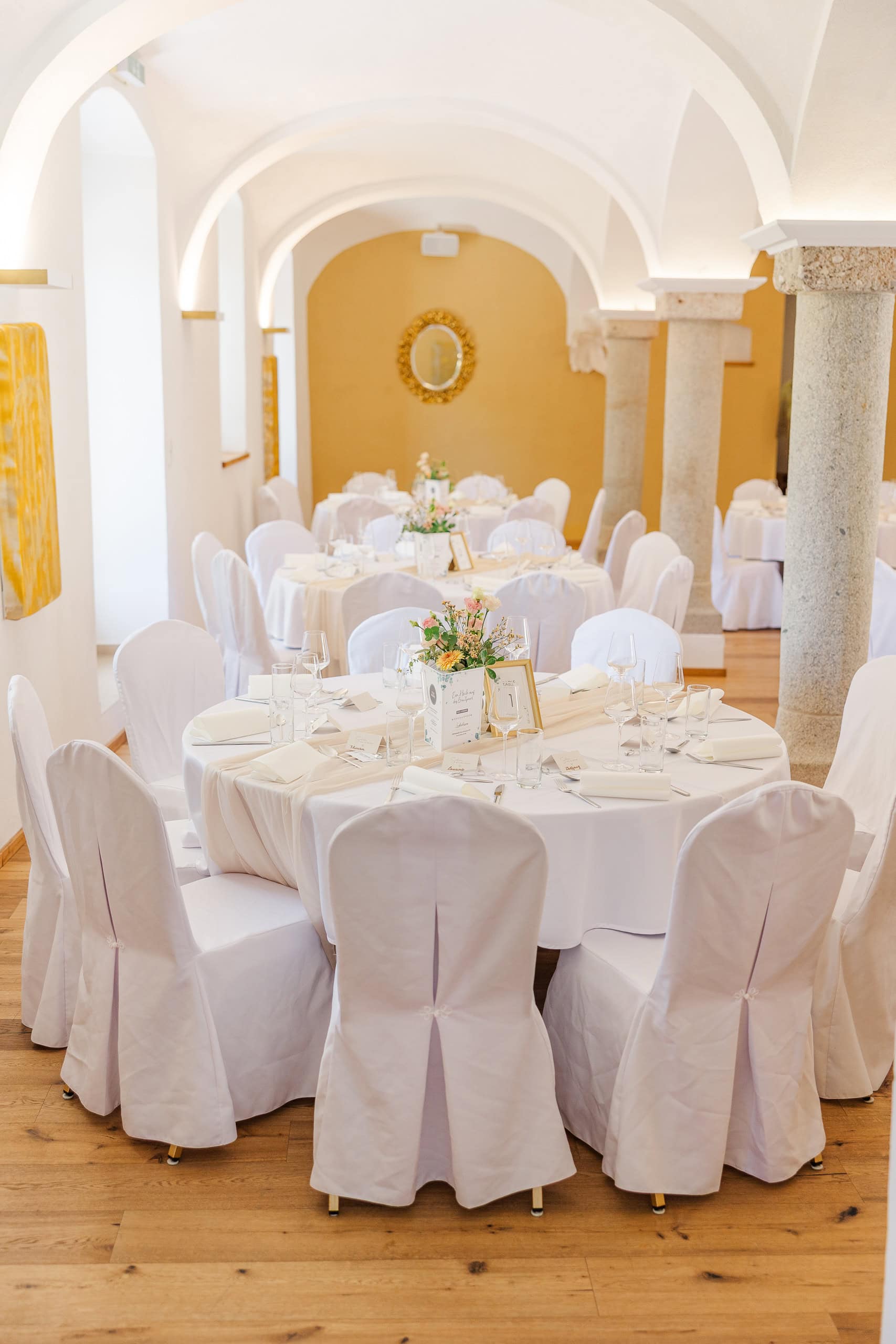 Das Abendessen fand im Festsaalgewölbe statt – die große Glastür zum Garten offen, sodass die Abendluft und das letzte Tageslicht hereinströmten. Die Deko war bewusst reduziert: Die Blüten aus dem Garten reichten völlig, um die Tische stilvoll zu schmücken.