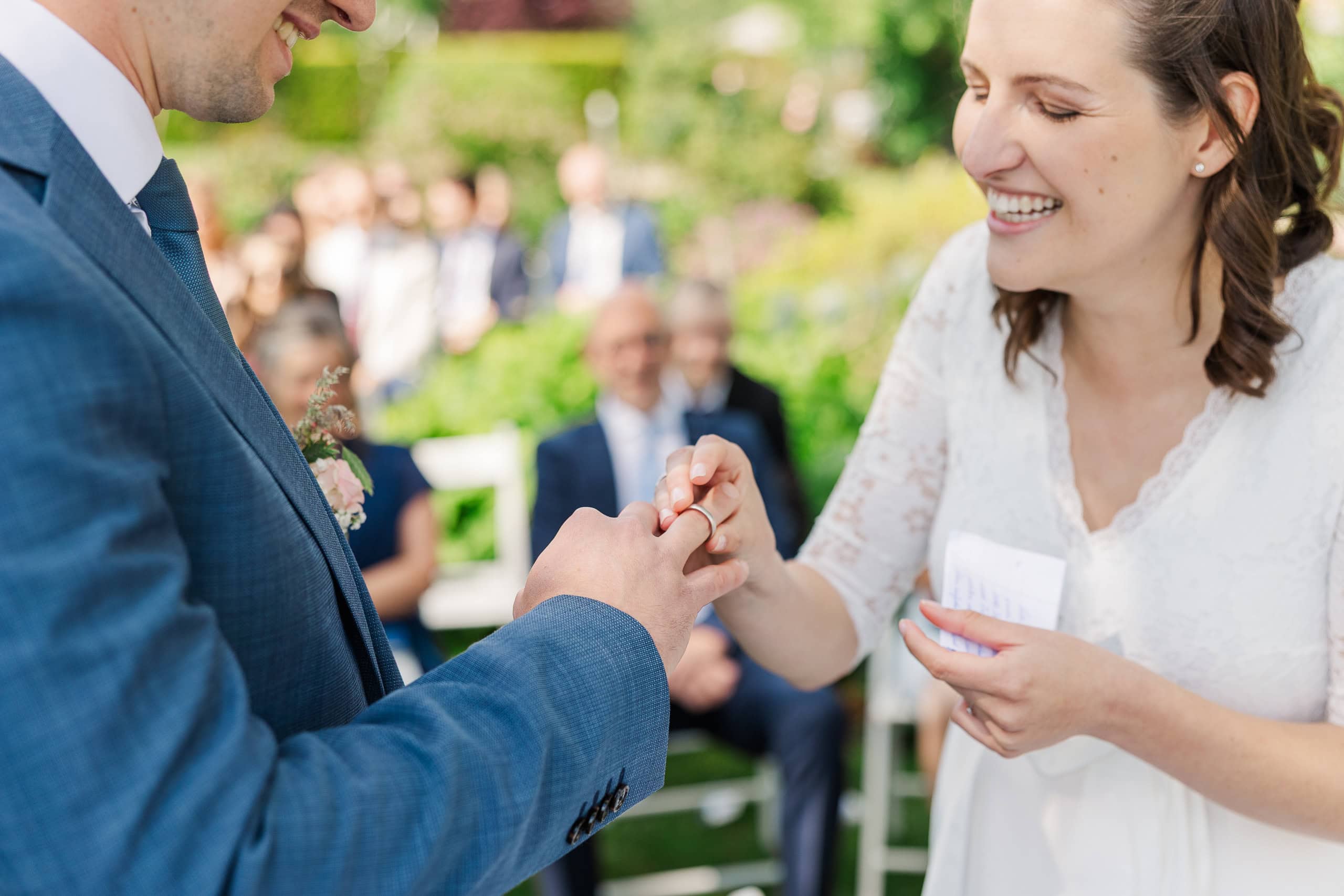 Ein Highlight waren die selbst geschriebenen Eheversprechen. Bei einer kleinen Hochzeitsgesellschaft wie dieser, wo jeder Gast zum engen Kreis gehört, entsteht eine besondere Intimität – die Worte kommen an, die Stille zwischen den Sätzen wiegt schwerer, und die Emotionen in den Gesichtern der Gäste erzählen ihre eigene Geschichte.