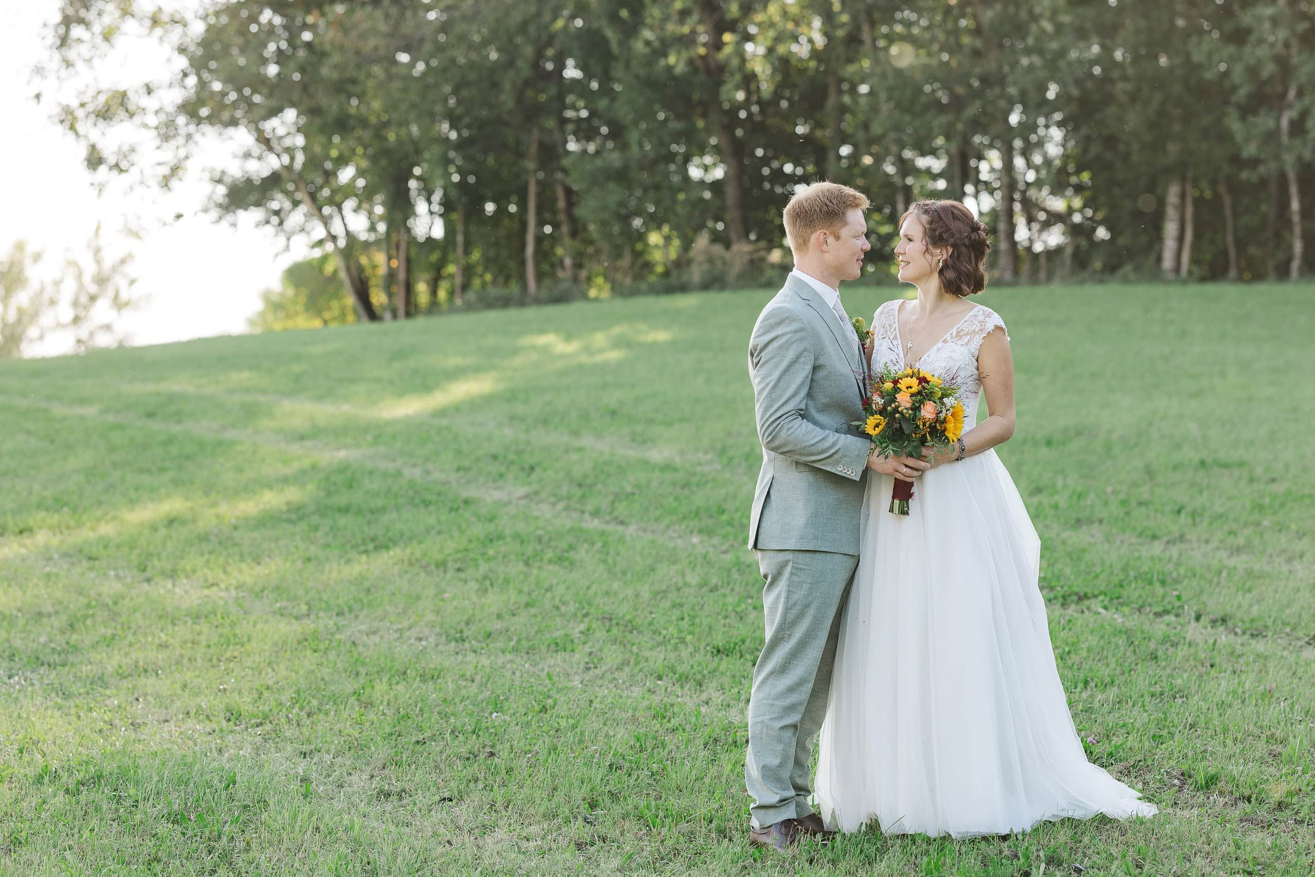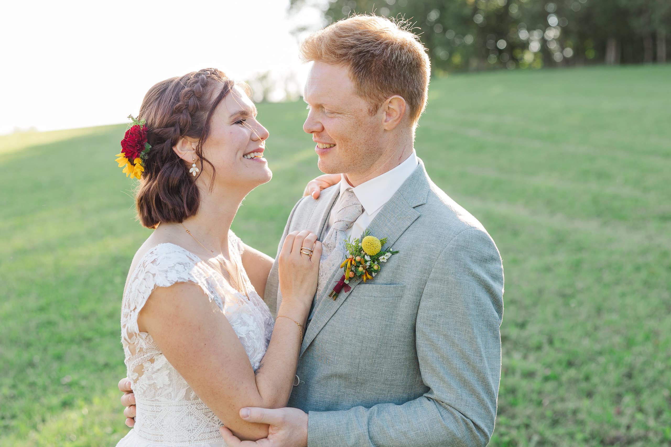 Auf dem Weg von Pollham zur Hofbühne Tegernbach haben wir zuerst einen kurzen Stopp auf einem großen Wiese am Waldrand eingelegt und dann noch direkt bei der Location geshootet – die letzten Minuten des Sonnenuntergangs wollte ich unbedingt nutzen. Wenn das Licht so golden und warm wird, braucht es nicht viel: ein paar Schritte zusammen, ein Blick, ein Lachen. Die schönsten Paarfotos entstehen genau dann, wenn man den Moment einfach passieren lässt.