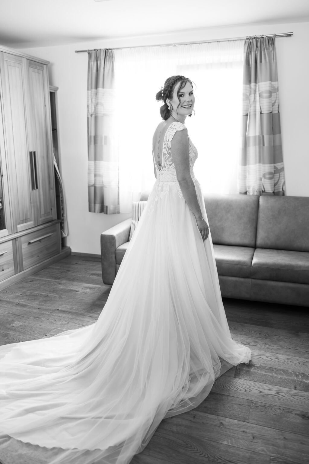 Der Tag begann getrennt: Daniel hat sich zuhause in St. Marienkirchen fertig gemacht – ruhig, konzentriert, mit den besten Kumpels an seiner Seite. Danach bin ich nach Pollham zu Margrets Elternhaus gefahren. Hier war die Stimmung eine ganz andere: aufgeregte Vorfreude, letzte Handgriffe am Kleid, die Mama mit Tränen in den Augen. In diesen Momenten vor der Trauung steckt oft die größte Emotionalität des ganzen Tages – deswegen nehme ich mir hier immer besonders viel Zeit.